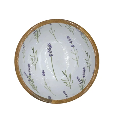Op zoek naar een stijlvolle schaal om (zomerse) salades of andere gerechten te serveren? Dit exemplaar van By Room is er één voor op uw wensenlijst! Het item is vervaardigd uit mangohout en heeft een rond design met een diameter van 25 cm. De binnenkant is voorzien van een sticker met lavendelprint voor een speels effect. Combineer de schaal met het bijpassende slacouvert voor een elegant geheel.