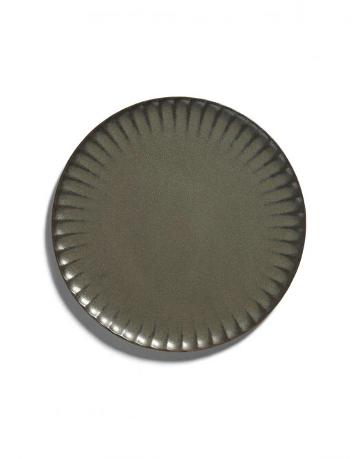 Het bord L van Serax INKU heeft een diameter van 24 cm en is 1,7 cm hoog, en is aan de rand voorzien van een decoratief ribbelpatroon. Het bord is gemaakt van steengoed (aardewerk) en is groen geglazuurd. Gebruik voor het serveren van gerechten.