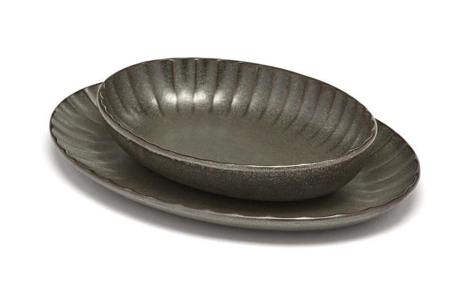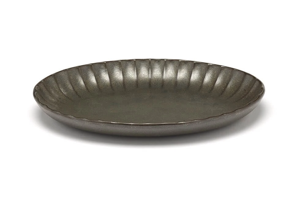 De ovale serveerschaal van Serax INKU heeft een diameter van 22 x 15,4 cm en is 2,7 cm hoog, en is aan de rand voorzien van een decoratief ribbelpatroon. De kom is gemaakt van steengoed (aardewerk) en is groen geglazuurd. Gebruik voor het serveren van gerechten.